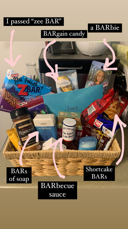 My Bible study group made a "Bar Box" for me, filled with all sorts of creative "bar" treats - on-sale Easter candy labeled "a BARgain," a BARbie doll, BARs of soap and a BARnes and Noble gift card. It was the sweetest, most thoughtful gift imaginable!
